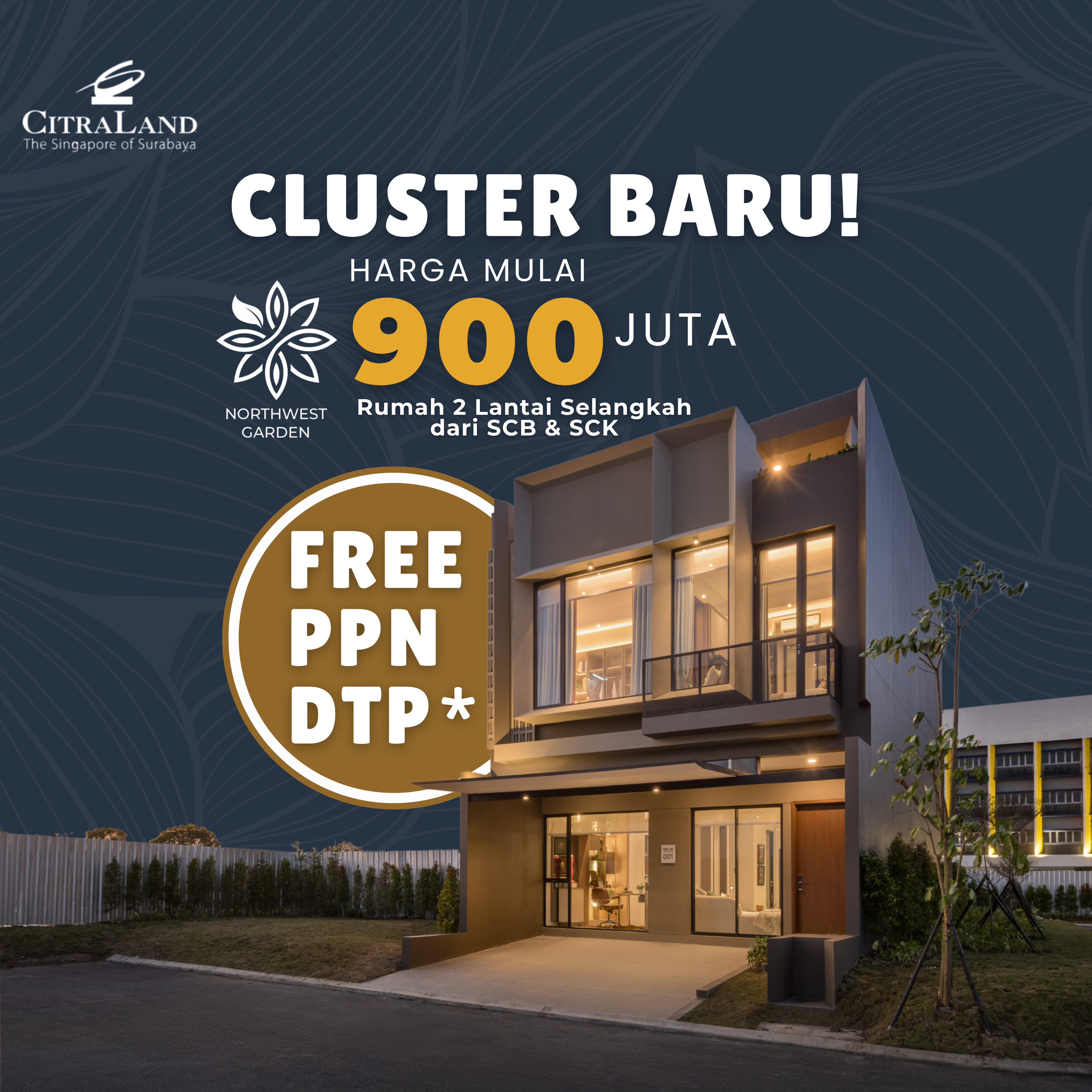 Rumah Idaman yang cocok untuk Orang Tua Siswa SCB & SCK dengan pilihan rumah lebar 4, 5, 6, dan 7. Rumah 2 lantai dengan harga mulai 900 juta. Anda akan mendapatkan keunggulan akses untuk selangkah ke Ciputra Arena, Sekolah Ciputra Kasih & Komersial Area. Penawaran eksklusif hanya di Cluster Northwest Garden, CitraLand Utara Surabaya.